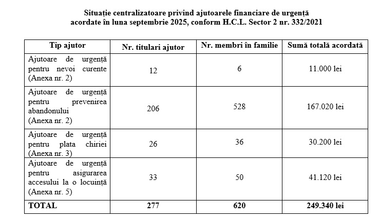 Situație centralizatoare privind ajutoarele financiare de urgență acordate în luna noiembrie 2025, conform H.C.L. Sector 2 nr. 332/2021