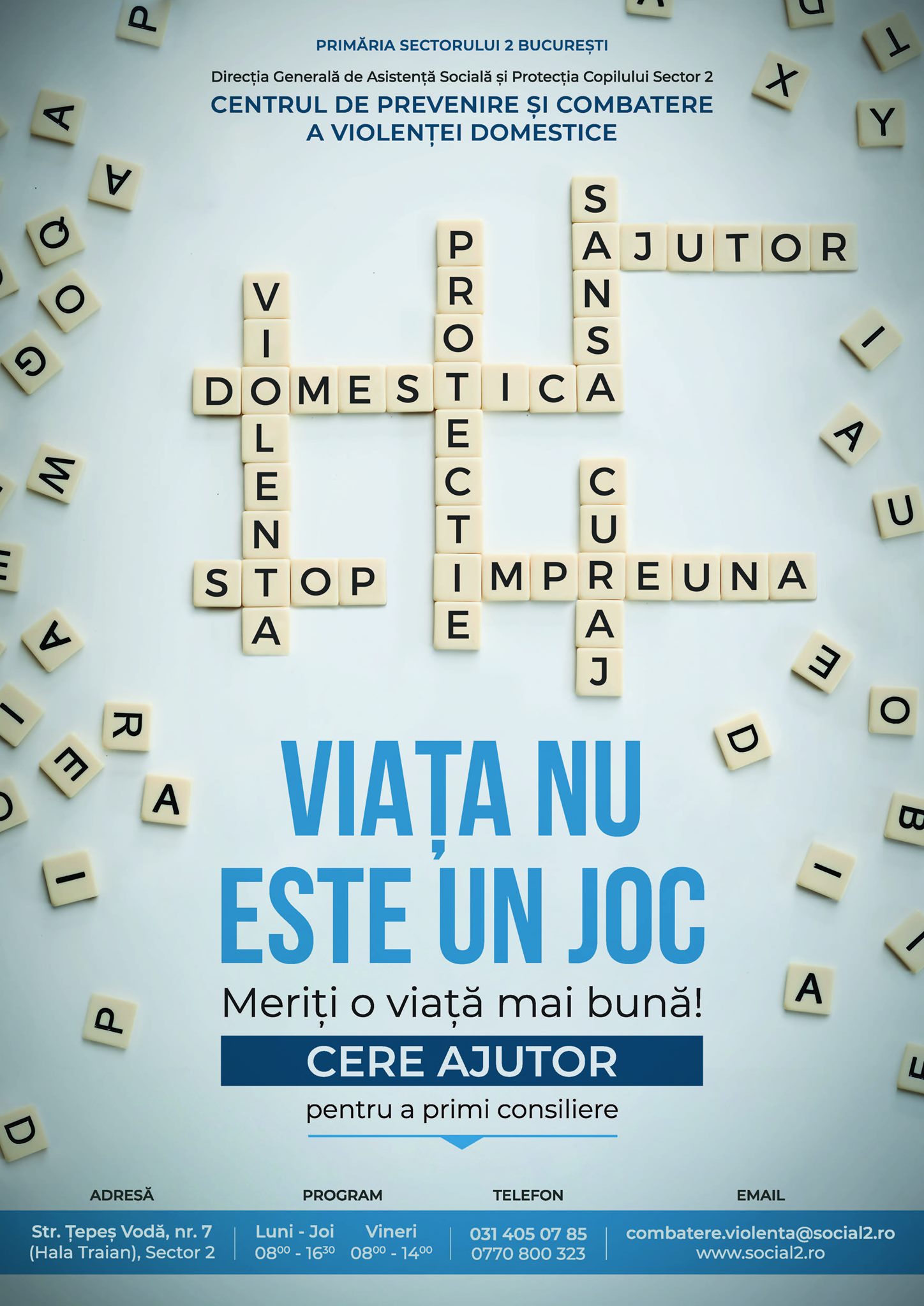 DGASPC Sector 2 oferă, prin intermediul Centrului de Prevenire şi Combatere a Violenţei Domestice, servicii gratuite de informare, consiliere socială, psihologică, juridică pentru victime ale violenţei domestice sau pentru persoane care prezintă risc de a trece prin violenţă din partea unuia sau mai multor membri ai familiei – persoane adulte, domiciliate pe raza administrativ-teritorială a Sectorului 2.