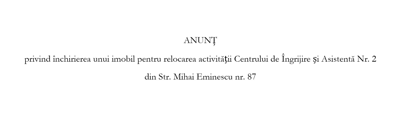 Anuntul nr 121994/27.06.2023, privind închirierea unui imobil pentru relocarea activității Centrului de Îngrijire și Asistentă Nr. 2 din Str. Mihai Eminescu nr. 87, prin procedura de negociere directa.