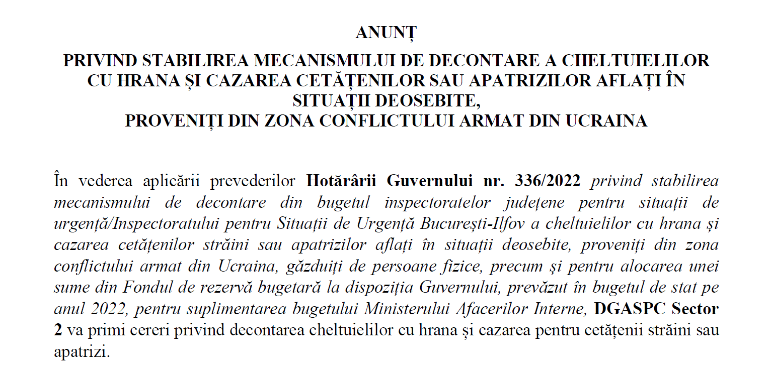 În vederea aplicării prevederilor Hotărârii Guvernului nr. 336/2022 privind stabilirea mecanismului de decontare din bugetul inspectoratelor județene pentru situații de urgență/Inspectoratului pentru Situații de Urgență București-Ilfov a cheltuielilor cu hrana și cazarea cetățenilor străini sau apatrizilor aflați în situații deosebite, proveniți din zona conflictului armat din Ucraina, găzduiți de persoane fizice, precum și pentru alocarea unei sume din Fondul de rezervă bugetară la dispoziția Guvernului, prevăzut în bugetul de stat pe anul 2022, pentru suplimentarea bugetului Ministerului Afacerilor Interne, DGASPC Sector 2 va primi cereri privind decontarea cheltuielilor cu hrana și cazarea pentru cetățenii străini sau apatrizi.