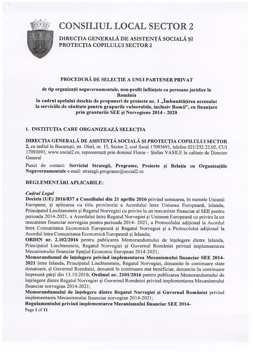 PROCEDURĂ DE SELECȚIE A UNUI PARTENER PRIVAT de tip organizații neguvernamentale, non-profit înființate ca persoane juridice în România în cadrul apelului deschis de propuneri de proiecte nr. 1 „Îmbunătăţirea accesului la serviciile de sănătate pentru grupurile vulnerabile, inclusiv Romii”, cu finanţare prin granturile SEE şi Norvegiene 2014 – 2020.