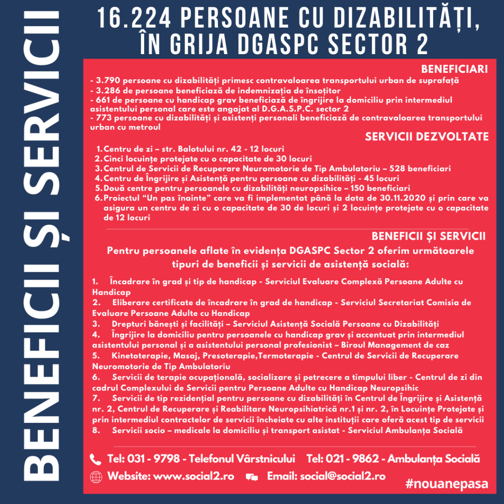 La data de 31 august 2020 în evidența D.G.A.S.P.C. Sector 2 se regăsește un număr de 16.224 persoane cu dizabilități care beneficiază de diverse servicii și beneficii de asistență socială.