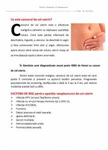 La nivel național, cancerul de col uterin reprezintă încă o problemă majoră de sănătate publică, fiind cel al treilea cel mai frecvent cancer întâlnit la populația feminină după cancerul de sân și cel colorectal și a patra cauză de mortalitate prin cancer la sexul feminin după cancerul de sân, cancerul colorectal și cancerul bronhopulmonar.