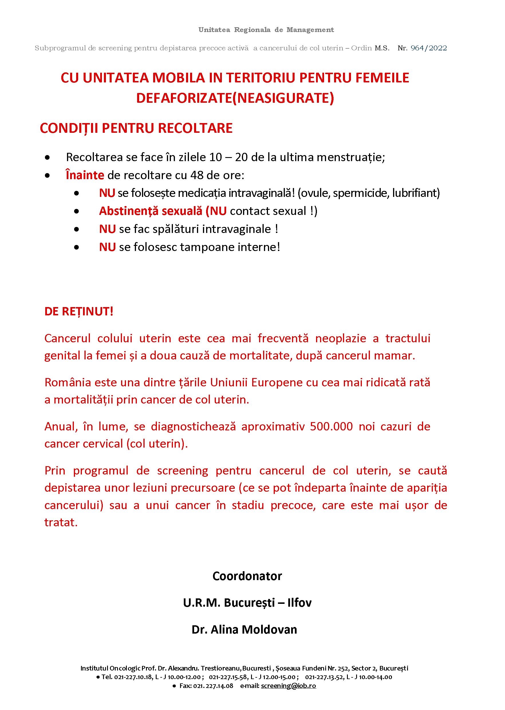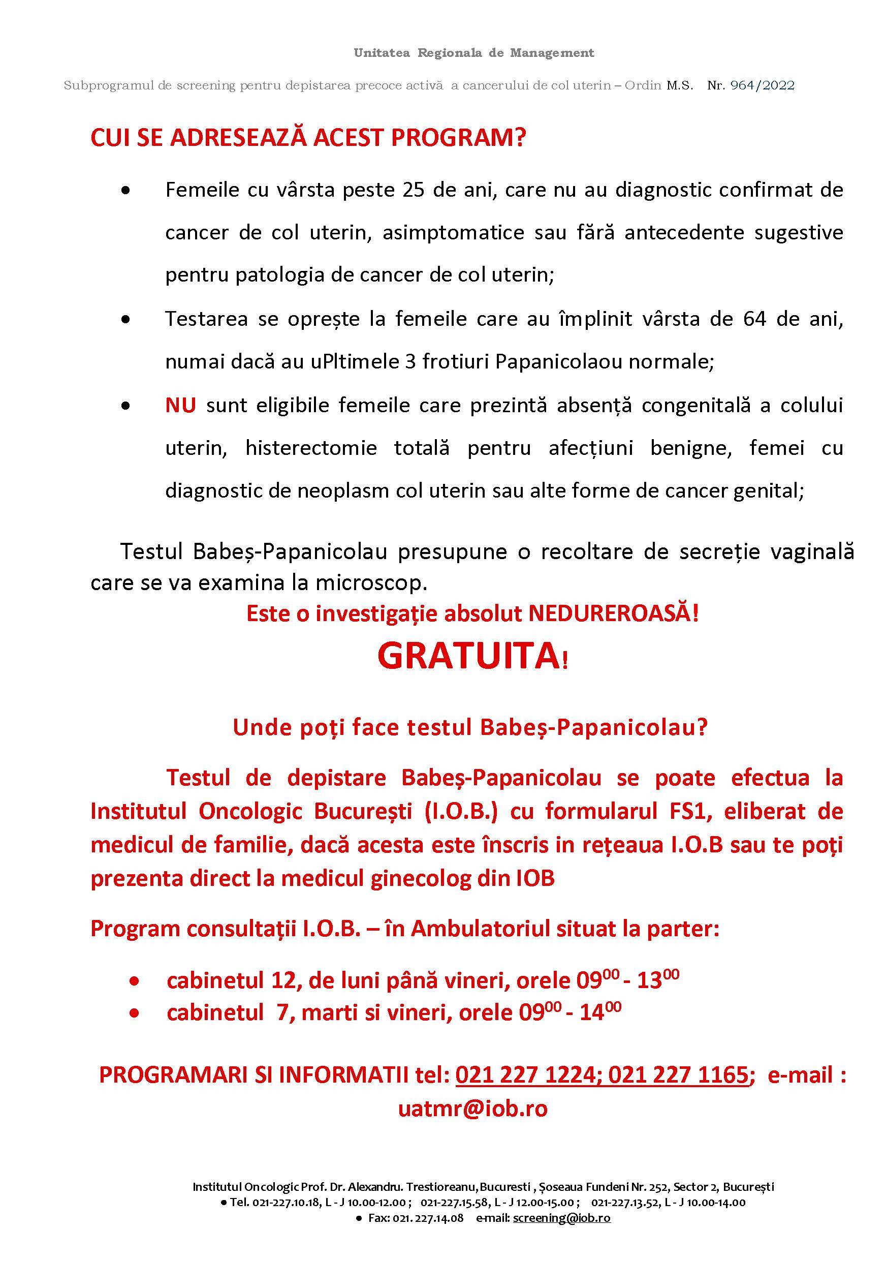 În perioada 28-30 iulie și 04-06 august, în incinta Complexului Pantelimon din Șos. Pantelimon nr. 301, Sector 2, București, vor fi prezente cadre medicale ale Institutului Oncologic București, care vor oferi consultații, doar în baza cărții de identitate, într-o unitate mobilă de testare gratuită.