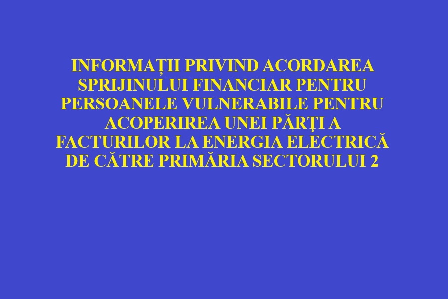 INFORMAȚII PRIVIND ACORDAREA SPRIJINULUI FINANCIAR PENTRU PERSOANELE VULNERABILE PENTRU ACOPERIREA UNEI PĂRŢI A FACTURILOR LA ENERGIA ELECTRICĂ DE CĂTRE PRIMĂRIA SECTORULUI 2