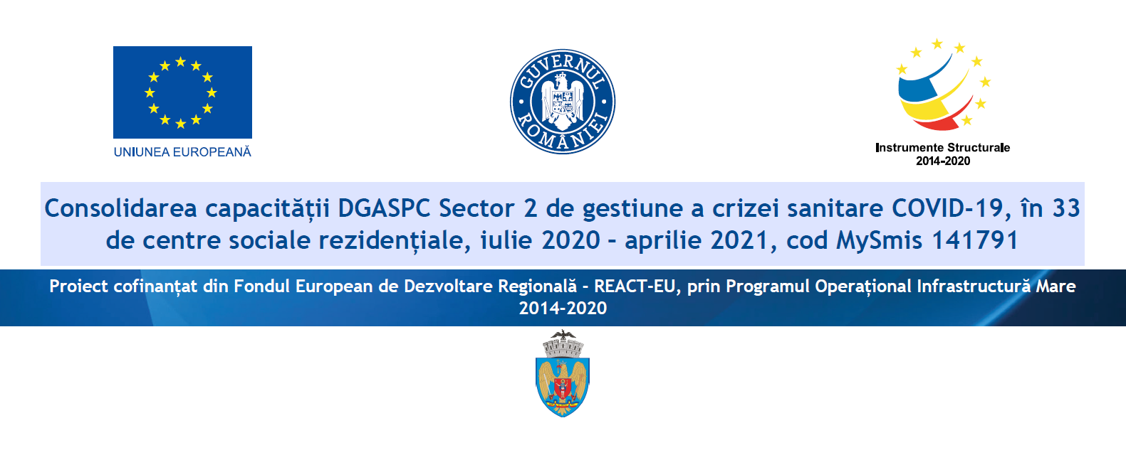 Titlul proiectului: „Consolidarea capacității D.G.A.S.P.C. Sector 2 de gestiune a crizei sanitare COVID-19 pentru beneficiarii și angajații din centrele sociale rezidențiale pentru perioada iulie 2020 – aprilie 2021” – Cod proiect MySMIS2014+: 141791