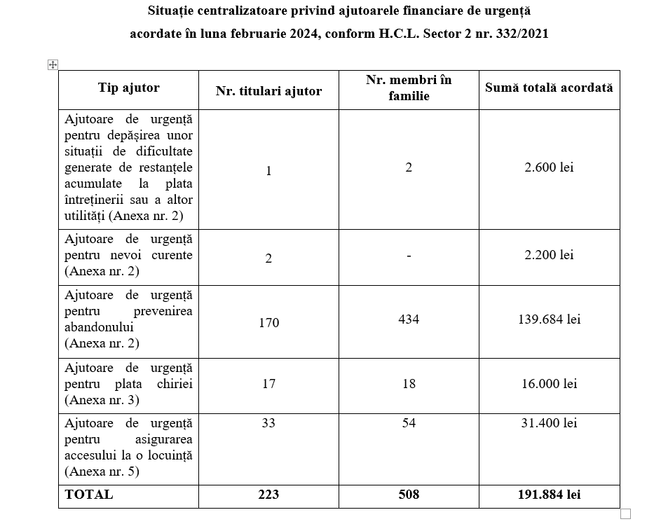 - Ajutoare de urgență pentru depășirea unor situații de dificultate generate de restanțele acumulate la plata întreținerii sau a altor utilități;