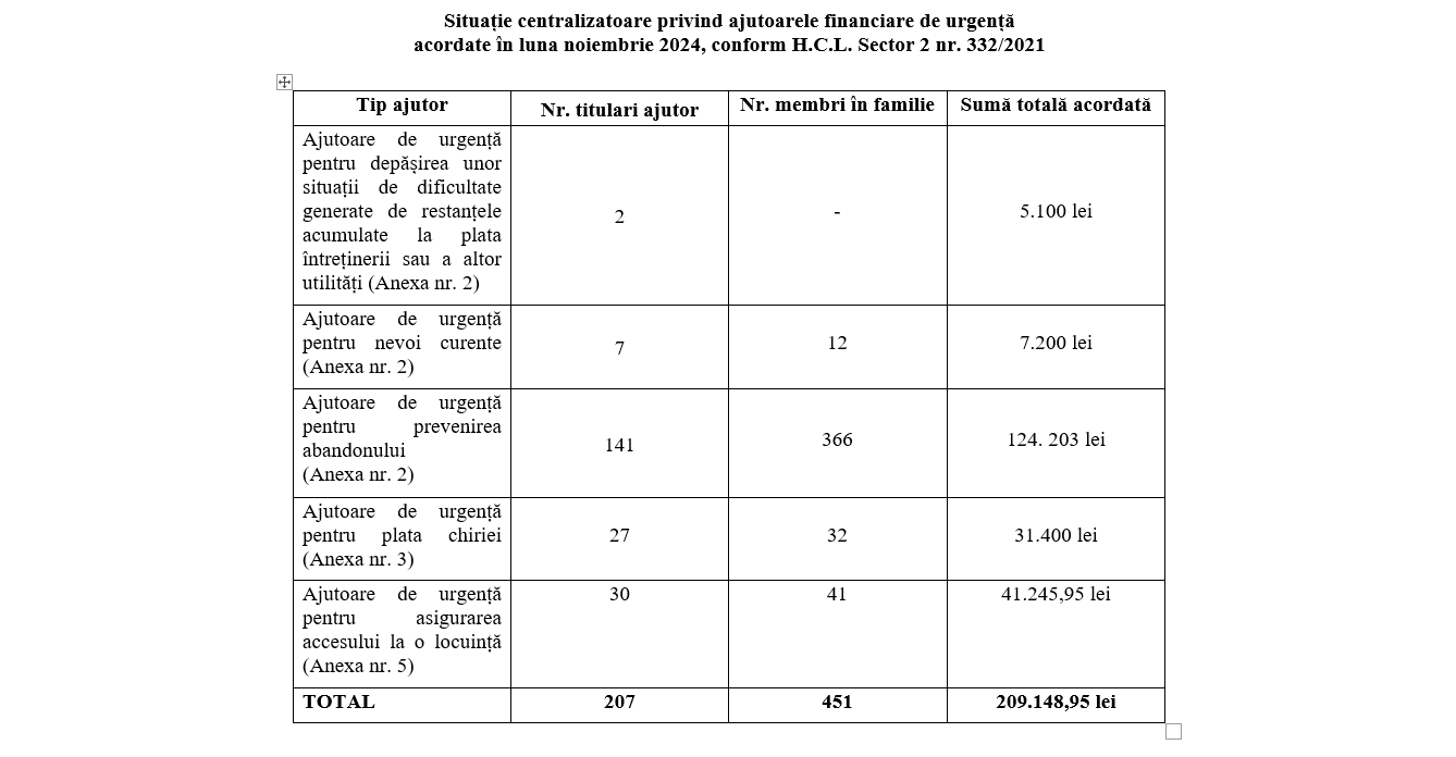 | Tip ajutor | Nr. titulari ajutor | Nr. membri în familie | Sumă totală acordată |