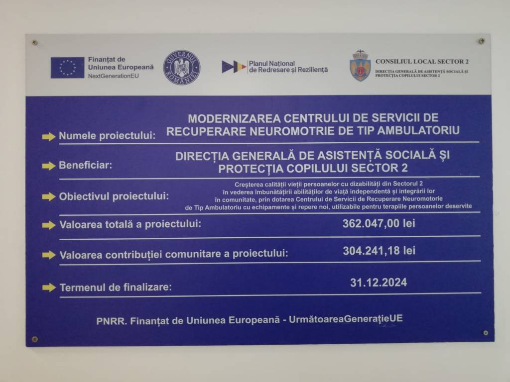 Direcția Generală de Asistență Socială și Protecția Copilului Sector 2, anunță public finalizarea implementării proiectului cu titlul ,,Modernizarea Centrului de Servicii de Recuperare Neuromotorie de Tip Ambulatoriu”.