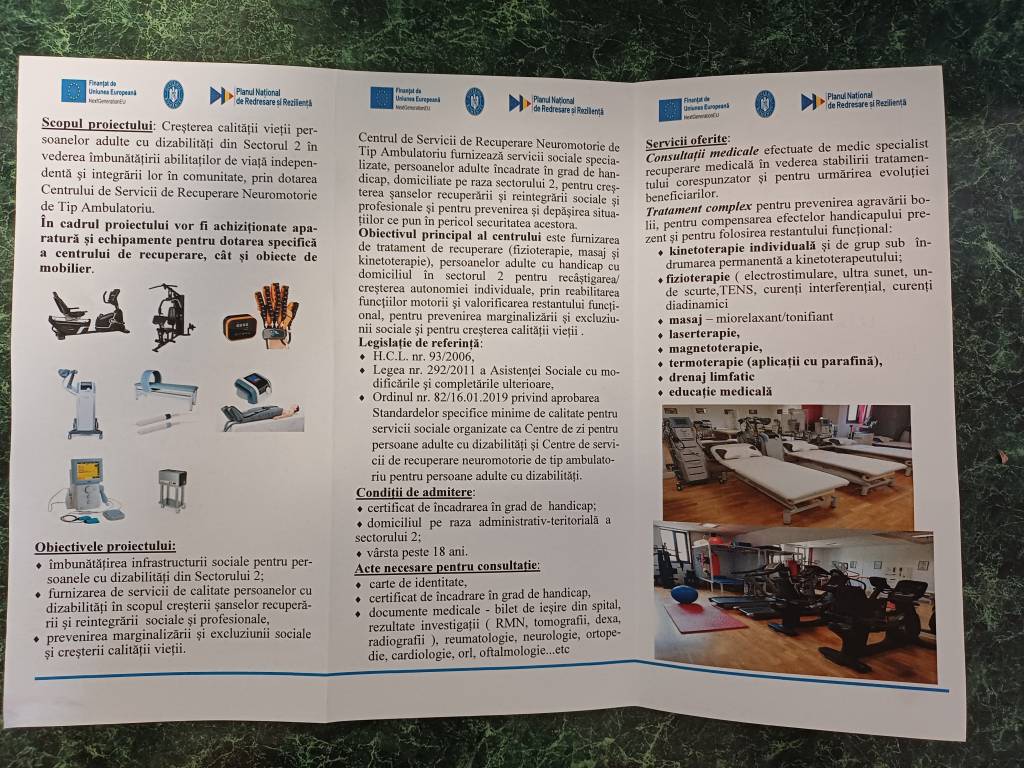 Scopul proiectului: Creșterea calității vieții persoanelor adulte cu dizabilități din Sectorul 2 în vederea îmbunătățirii abilitaților de viață independentă și integrării lor în comunitate, prin dotarea Centrului de Servicii de Recuperare Neuromotorie de Tip Ambulatoriu. În cadrul proiectului au fost achiziționate obiecte de mobilier, echipamente și aparatură medicală pentru dotarea specifică a centrului de recuperare.